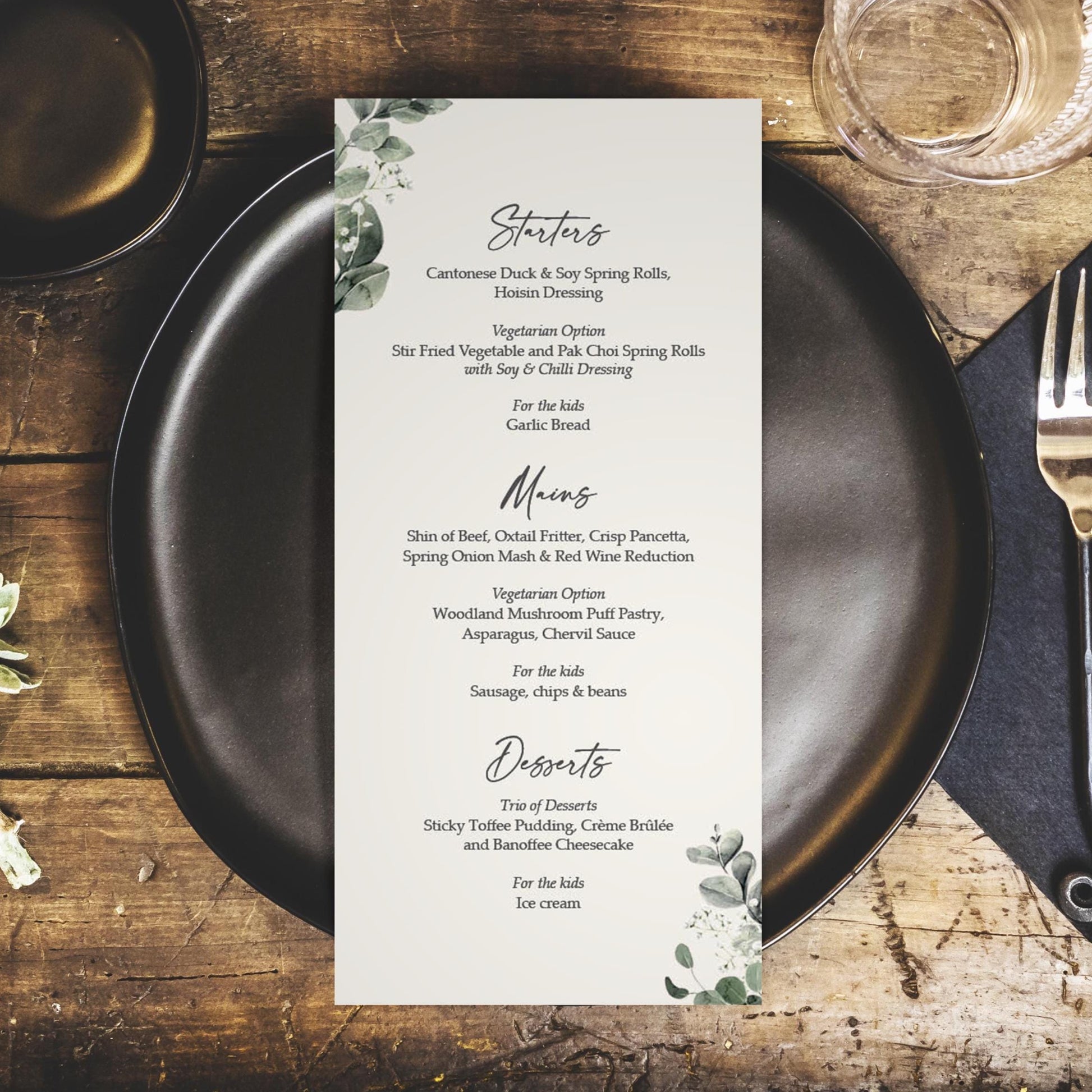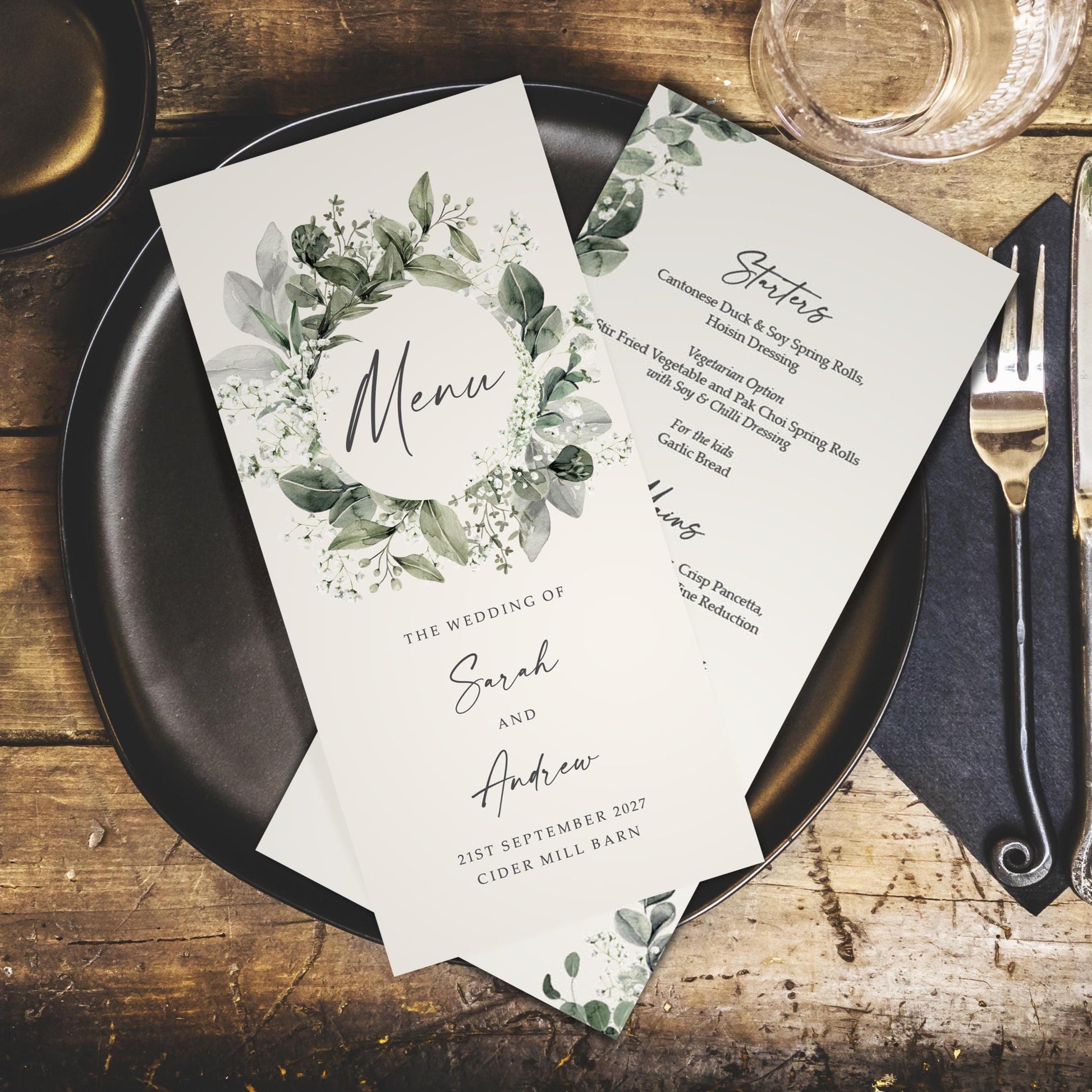 Baby's breath wedding menus are the perfect way to showcase your wedding menu with elegance and personal touch. These DL size menus feature delicate gypsophila greenery decor, creating a fresh and natural look that complements any greenery wedding theme. Designed as personalised wedding menus, each card can be customised with guest names and their chosen dishes, ensuring a smooth dining experience and adding a thoughtful detail to your wedding table decorations.