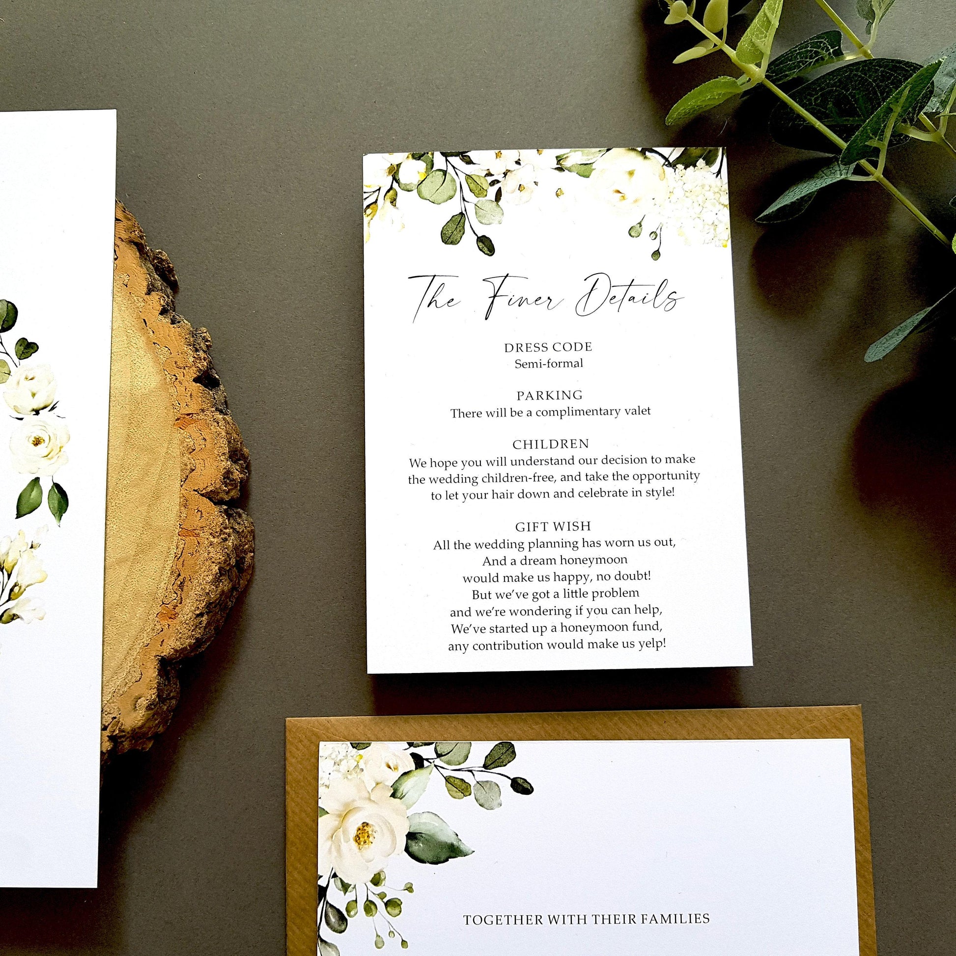 White floral with greenery wedding invitations features A5 (210x148mm) invitation with two double sided inserts. We can include any wording on the inserts and the pics are just an example for instance you can replace the menu with other wording. Our invitations also come with a choice of envelopes for both the invitation and RSVP card.