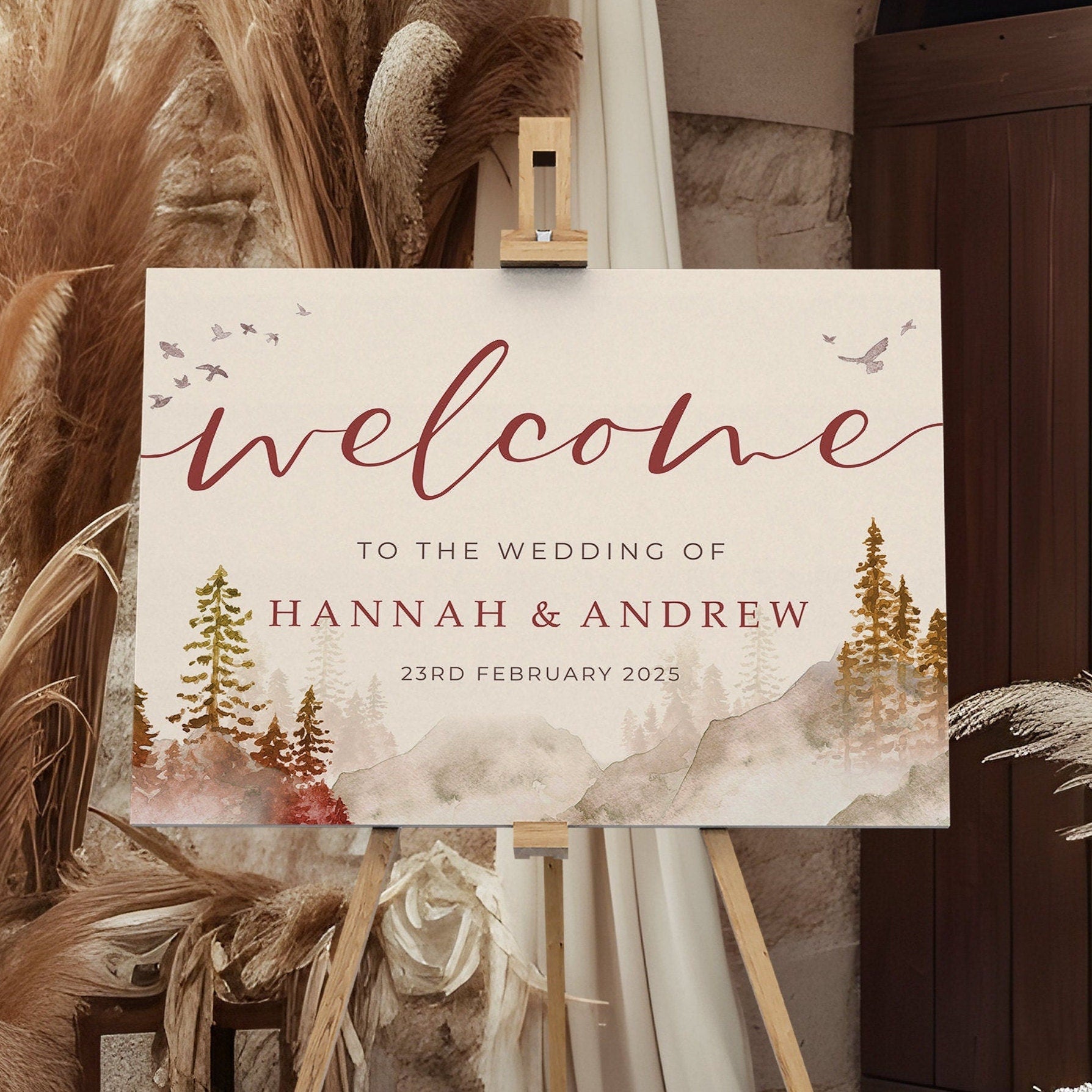 Autumn forest A1 or A2 Welcome Wedding Sign - Eucalyptus White Floral Design printed on PVC Foamex Board ready to place on an easel