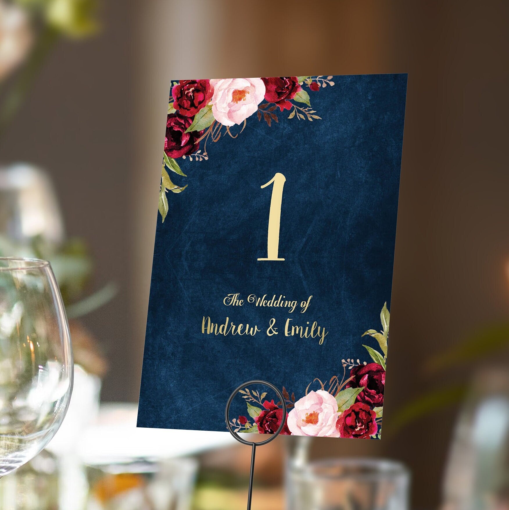 Blue & burgundy table numbers or table names in any colour font. You can have table numbers and top table or you can have other names like places, countries, colours etc.