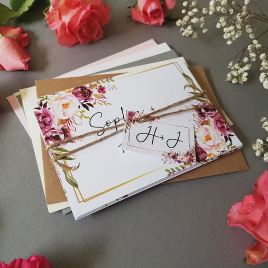 Our blush gold concertina wedding invitations & stationery range is our favourite collection here at Sienna Mai. The elegance of the floral display entwined with a metalic geometric border. We can customise these to any colour including the flowers and the geometric gold design. Why not request these in silver, gold, rose gold or copper. The flowers can also be done in any colour to match your bouquet. These really wow and have had amazing feedback from our wedding couples.