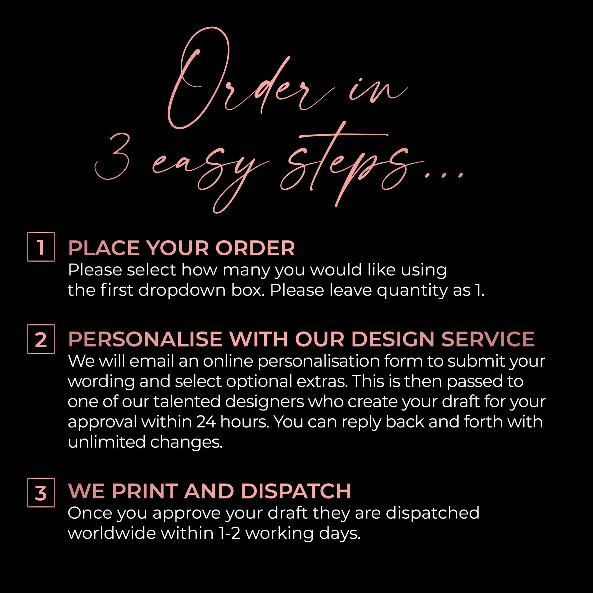 After you place your order, we’ll email you a simple online personalisation form with all the questions we need to create your perfect wedding stationery.