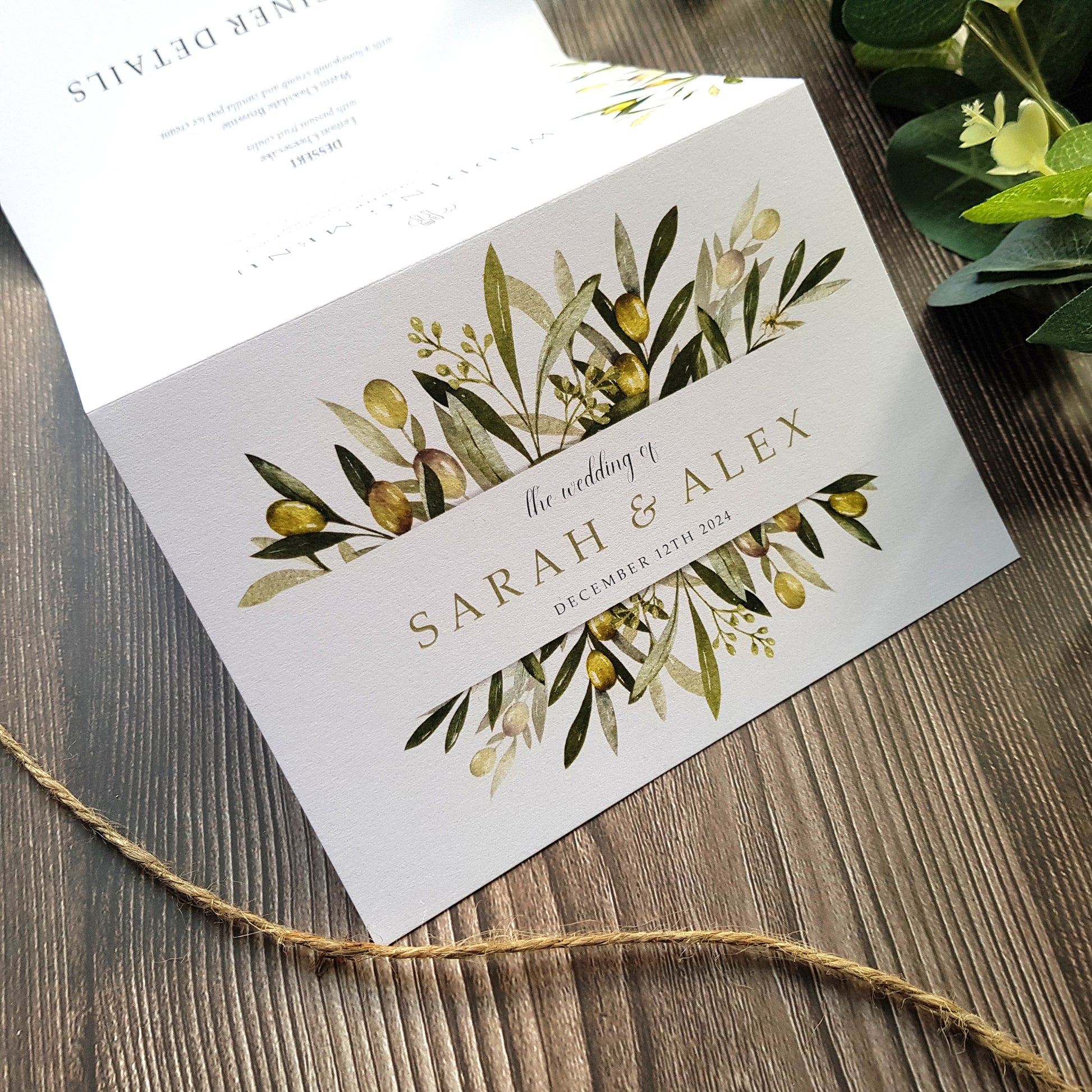 Olive concertina wedding invitations range feaure rustic charm with a hint of the mediterranean with an array of olive branches. With all matching wedding stationery availablethese make aperfect choicefor all weddings particularly destination weddings in Greece, Cyprus or Italy.