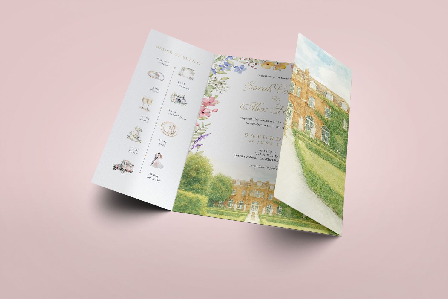 Venue gatefold wedding invitations feature a watercolour illustration painting effect of your wedding venue and a colourful floral garden border.